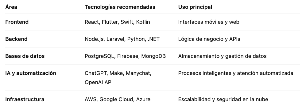 El código se desarrolla con tecnologías modernas (React Native, Flutter, Laravel, Node.js, etc.).