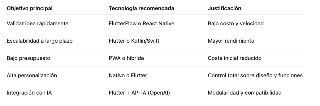 Elegir la tecnología correcta depende de los objetivos de tu negocio, presupuesto, público y tiempo de lanzamiento.